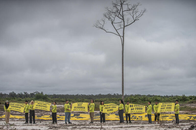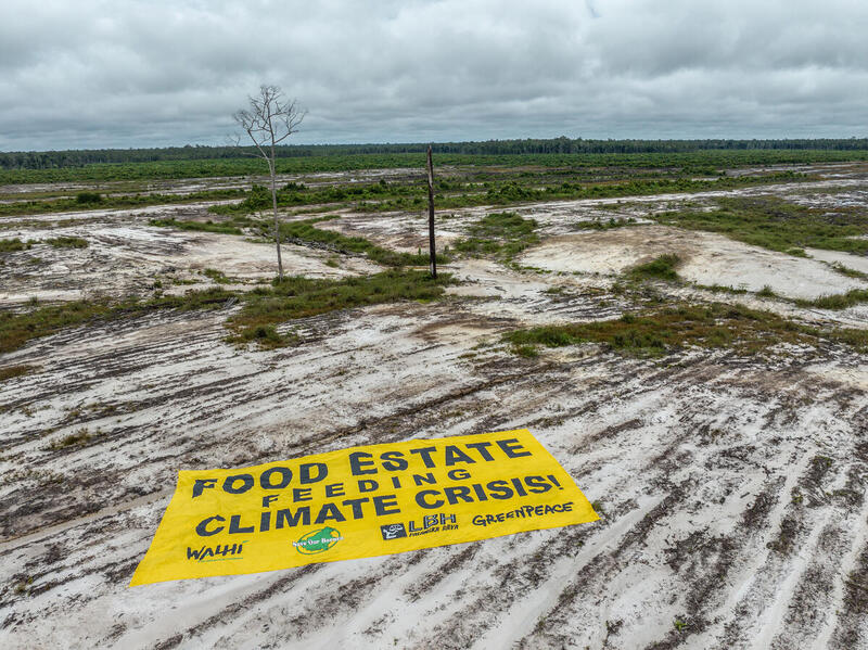 Di bawah cuaca mendung tanggal 2 Desember 2023 lalu, spanduk kuning lebar dibentangkan tepat di lahan Proyek Strategis Nasional (PSN) untuk program ketahanan pangan food estate yang berlokasi di desa Tewai Baru, Kabupaten Gunung Mas, Kalimantan Tengah (Kalteng). Food Estate Feeding Climate Crisis (Food Estate memberi makan krisis iklim), begitu tulisan di spanduknya.